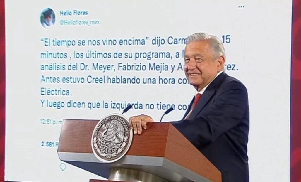 Entre risas, López Obrador lee un mensaje del caricaturista Helio Flores , quien mencionó los tiempos en el programa radiofónico de Carmen Aristegui para hablar de la reforma eléctrica.