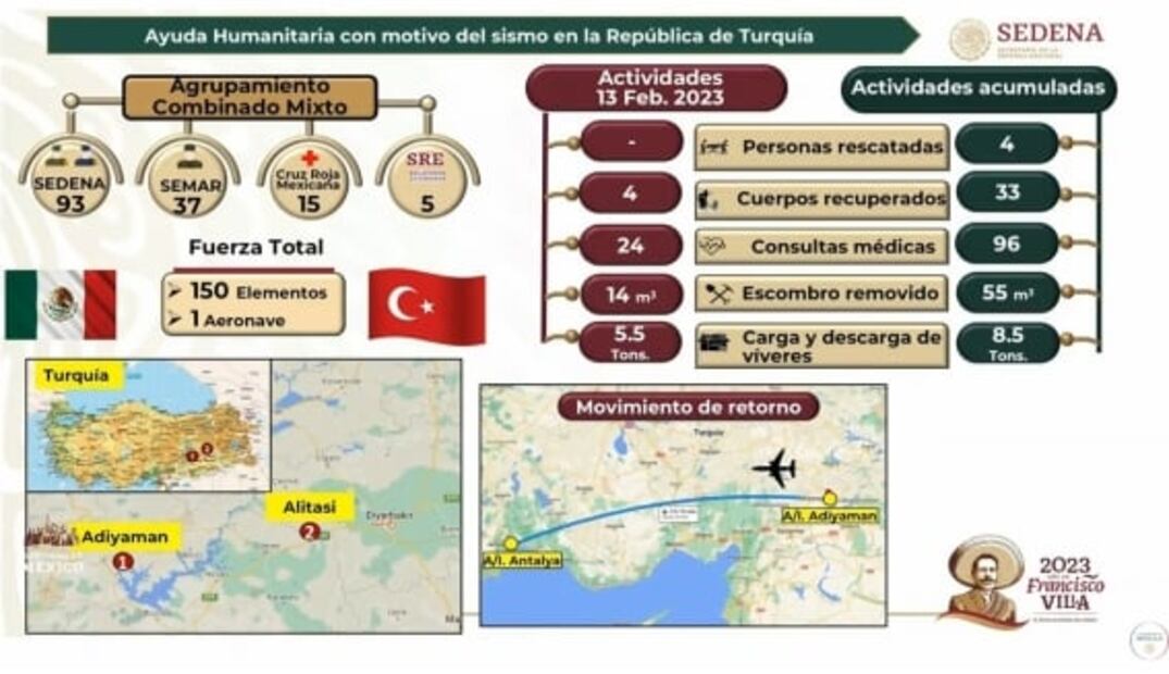 07:24- El canciller Marcelo Ebrard informa que ayer se estableció contacto con la ONU para, este martes, hacer el depósito de 6 millones de dólares destinados a Siria. El secretario de Relaciones Exteriores menciona que mañana se empezarán a retirar los equipos de rescate en Turquía para empezar las demoliciones, ante la devastación por el terremoto.