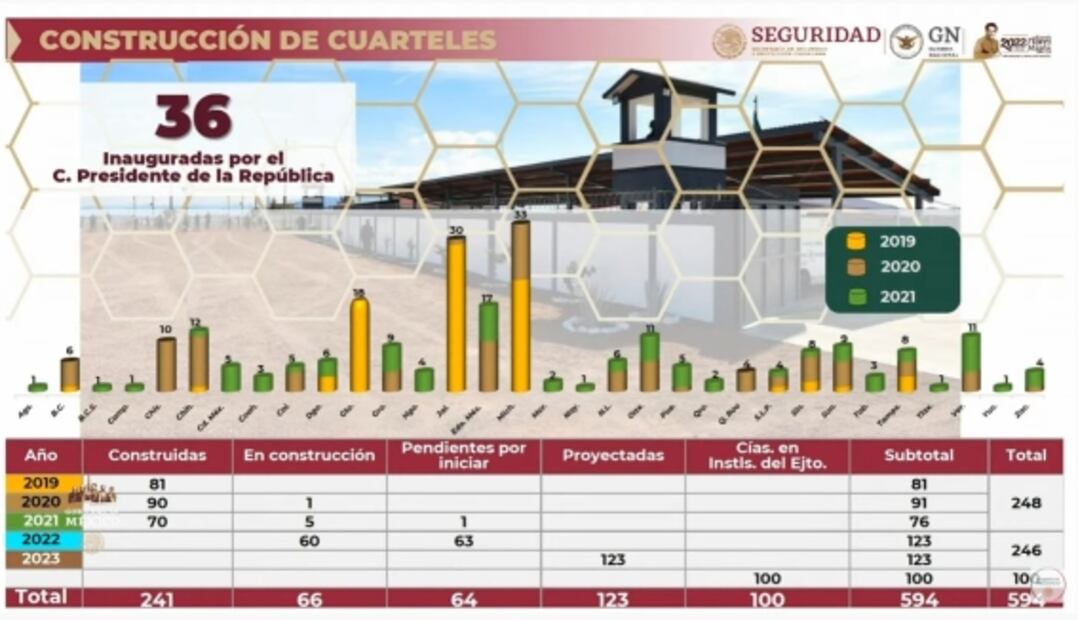 Ya están construidos 241 cuarteles de la Guardia Nacional, informa el comandante Luis Rodríguez Bucio. Destaca apoyos a la Secretaría del Bienestar en la dispersión de programas.