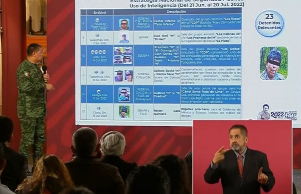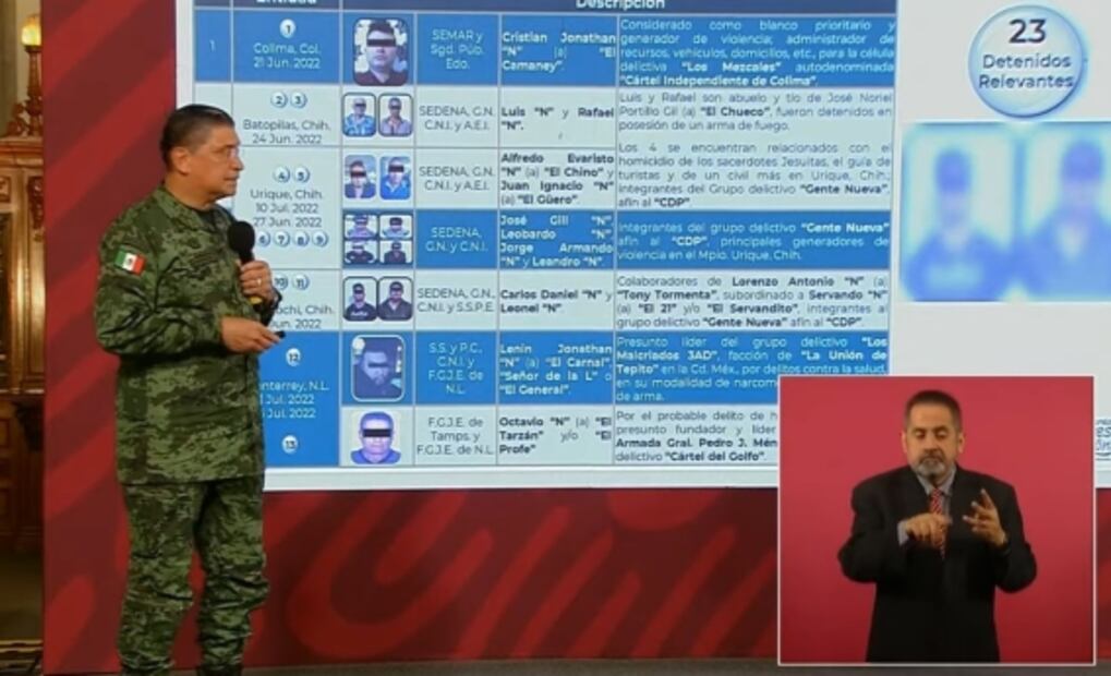El general Luis Cresencio Sandoval , secretario de Defensa , destaca la presencia de elementos y la inteligencia aplicada para lograr detenciones, como de sujetos relacionados con “El Chueco”, hombre vinculado con el asesinato de dos jesuitas y un guía de turistas en Chihuahua.