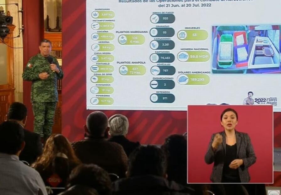 También señala Sandoval acciones en las aduanas como estrategia de seguridad nacional, donde se han decomisado drogas, armas y dinero en efectivo, así como detenciones.