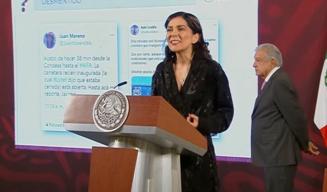 07:26- Elizabeth García Vilchi s, lectora de la sección “quién es quién en las mentiras de la semana”, exhibe a los periodistas Azucena Uresti , Ciro Gómez Leyva y Carlos Loret de Mola por informar que estaba cerrada la vía recién inaugurada para llegar al AIFA: “Fue cerrada unas horas para limpiarla bien”.
