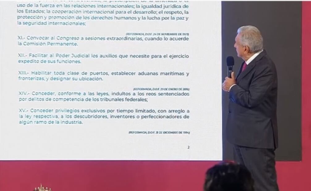Destaca que hasta ahora se le puede juzgar a los expresidentes por traición a la patria . Señala que en el Senado tienen congelada una iniciativa que mandó. “Es increíble que la oposición no quiera aprobarlo (...) cómo, si son opositores, si están los de FRENAAA 1 y los de FRENAAA 2 (...)”, apunta y llama a aprobar la reforma para juzgar al presidente en funciones.