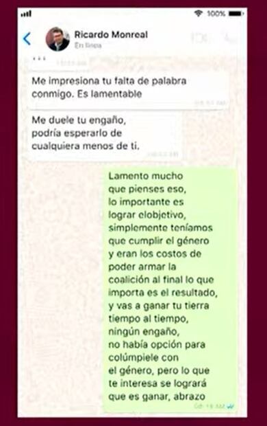 Layda Sansores , gobernadora de Campeche, reveló a través de su programa en redes "El Martes del Jaguar" las conversaciones de WhatsApp del senador y aspirante presidencial Ricardo Monreal, presidente de la Junta de Coordinación Política (Jucopo), con el presidente nacional del PRI, Alejandro Moreno.