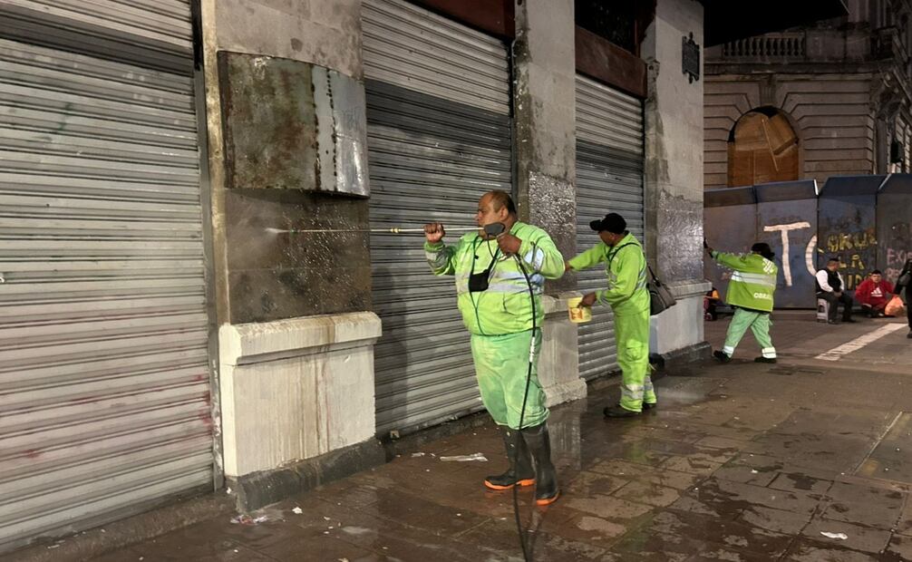 Personal de limpieza inician trabajos de limpia y quita de pintas en calle 5 de Mayo.