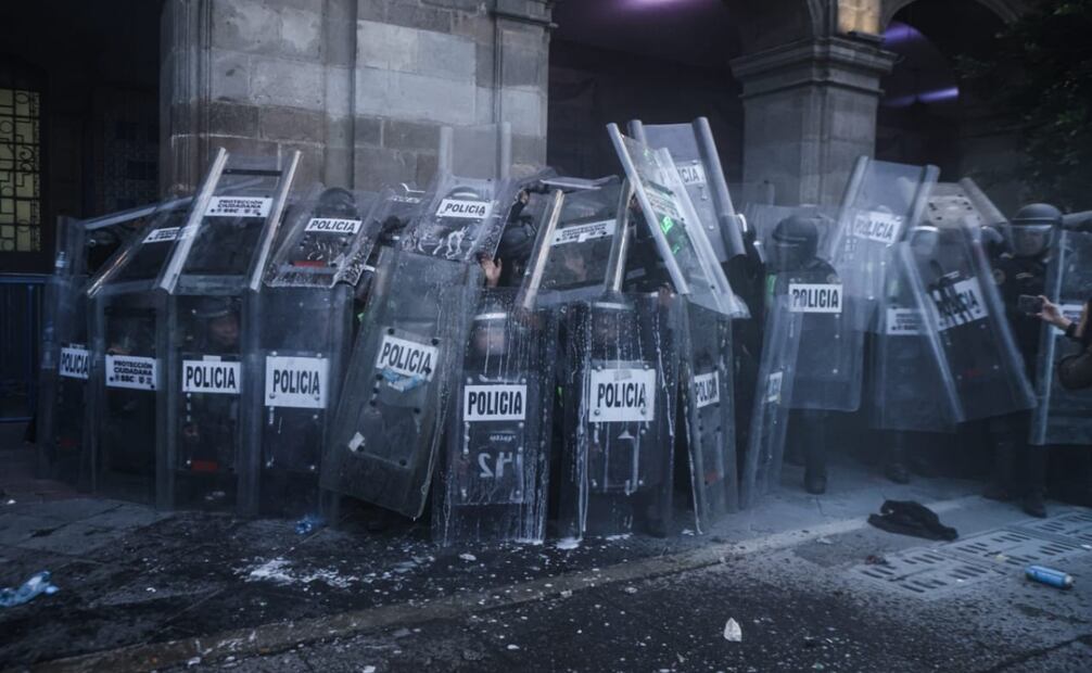 Bloque negro llega al Zócalo de la CDMX y empieza a lanzar explosivos caseros a Palacio Nacional y a la Catedral Metropolitana.