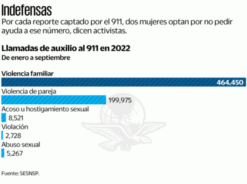 De enero a septiembre de 2022, el 911 atendió 680 mil 941 peticiones de auxilio por esos motivos; es decir, 2 mil 522 diarias, de acuerdo con la Información sobre violencia contra las mujeres, del Secretariado Ejecutivo del Sistema Nacional de Seguridad Pública (SESNSP).