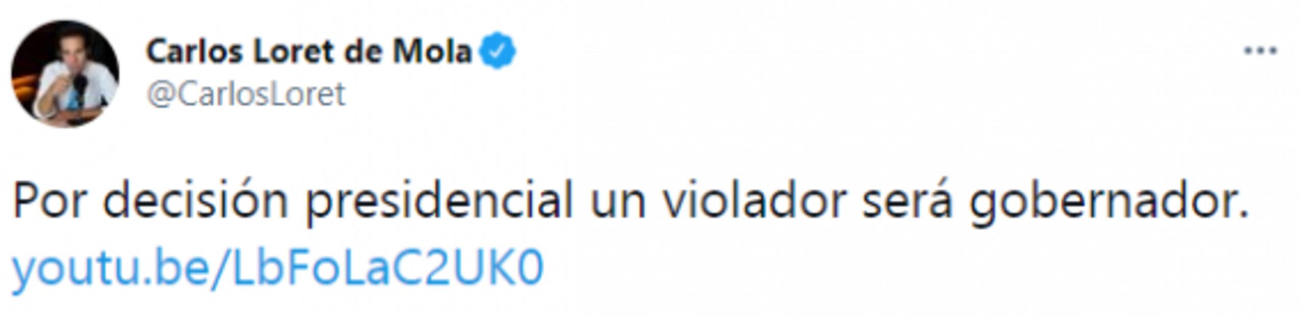 El periodista Carlos Loret de Mola escribió en un tuit: "Por decisión presidencial un violador será gobernador".