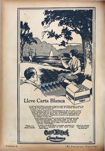 En los años 20 la cerveza se consideraba una de las mejores bebidas del país, incluso se publicitaba como un remedio casero. Un ejemplo de ello fueron los anuncios de Carta Blanca, los cuales mostraban sus “bondades” y hasta se consideraba un “complemento alimenticio” que daba energía y mejoraba la salud.