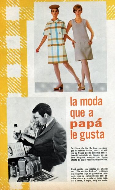 En los años sesenta y setenta, algunas marcas de ropa de mujeres publicaban anuncios donde se decía que ciertos vestidos serían “la moda que le gustaba a papá”. En el anuncio de 1969, con fondo amarillo, se puede leer que él recibía sus regalos vestido “a la moda”, con un traje “muy elegante” de gabardina, camisa blanca y corbata. Colección Carlos Villasana.