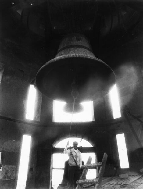 Leopoldo Flores hace sonar la campana "María de Guadalupe", de 19 toneladas, en la Catedral Metropolitana de la Ciudad de México. 20 de octubre de 1990. Archivo/EL UNIVERSAL