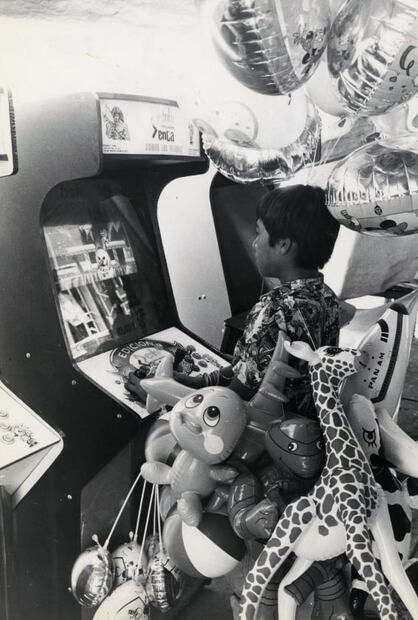 Un pequeño vendedor de globos juega frente a una máquina de videojuegos en abril de 1994. Foto: Alfonso Manzano, Archivo de EL UNIVERSAL.