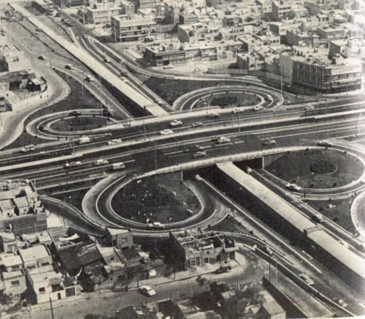 La Calzada de Tlalpan cambia de nombre a Calzada San Antonio Abad al pasar el Viaducto. Aquí una toma aérea del Viaducto, mejor conocido como "el trébol" en 1963. Colección Villasana - Torres.