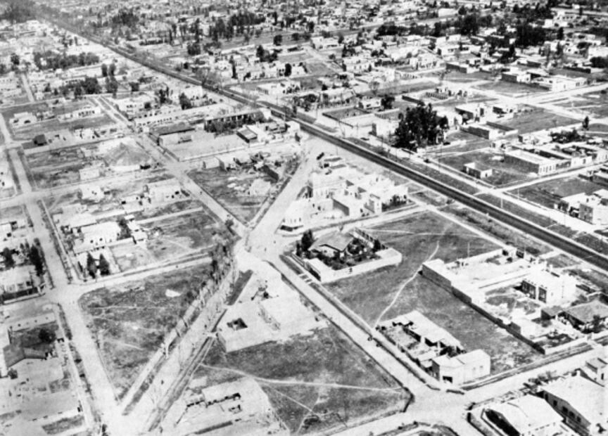 Una toma aérea de 1928 en la que se aprecia parte de la antigua delegación General Anaya, a la altura de lo que actualmente sería el cruce de Emperadores y la diagonal de la calle de Ajusco; la vía que se aprecia al fondo es la Calzada de Tlalpan, muy cerca de donde hoy se encuentra el Metro Portales. Colección Villasana - Torres / Atlas General del Distrito Federal.