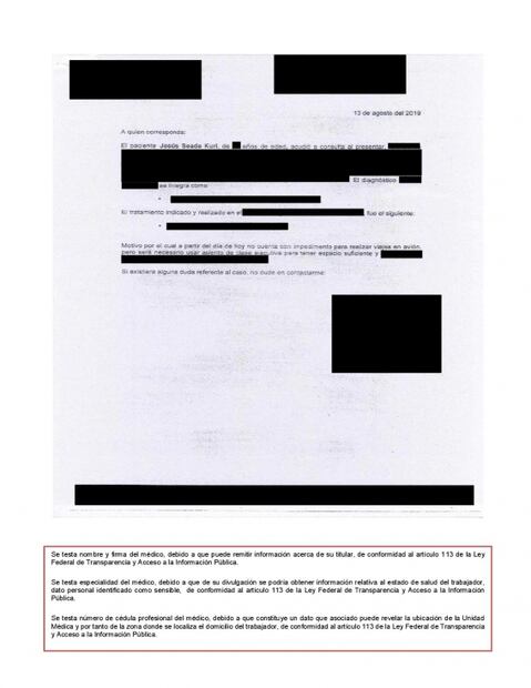 En uno de ellos, el oficio número UDT-4674/2020, García Moreno asegura que el subsecretario Seade no puede viajar “por disposición médica” en espacios reducidos por lo que se le autoriza a viajar en clase Business y más adelante justifica que le dieron esos asientos porque “la compra del boleto de avión se hizo vía agencia de viajes, misma que genera las compras de acuerdo a la disponibilidad de los vuelos en ese momento”. Y ante la insistencia del ciudadano solicitante, le enviaron un informe médico, en el que, sin dar el nombre del médico tratante ni su especialidad, que se omitieron por protección de datos, hablan de un padecimiento de Jesús Seade que nunca especifican, pero dice textual el reporte médico: “Motivo por el cual a partir del día de hoy no cuenta con impedimento para realizar viajes en avión, pero será necesario usar asiento en clase Ejecutiva para tener espacio suficiente”.