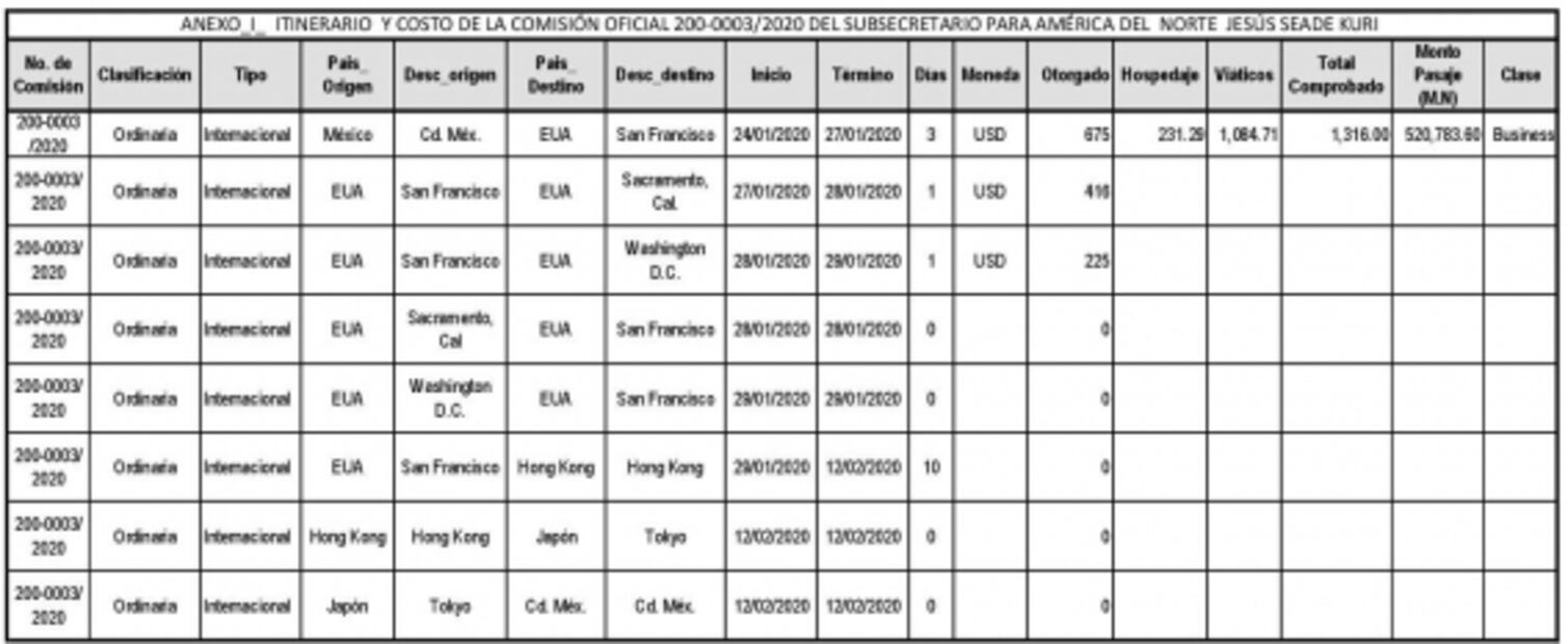 Hubo incluso un viaje que, para simular, Seade Kuri pidió una comisión a Vancouver en Canadá , que le fue autorizada con el numero 200-0060/2019 por 61 mil 189 pesos, en la que supuestamente estuvo del 17 al 28 de mayo de 2019, pero se presume y eso es parte de la investigación, que la mayor parte de esos días estuvo en Hong Kong, y que solo pasó por Vancouver para hacer conexión a la ciudad asiática, su destino final. Todas las comisiones oficiales, con los viáticos y pasajes correspondientes, le fueron autorizadas por las áreas administrativas de la SRE, a pesar de que no había un motivo ni un programa oficial para que el subsecretario de América del Norte viajara hasta Hong Kong.