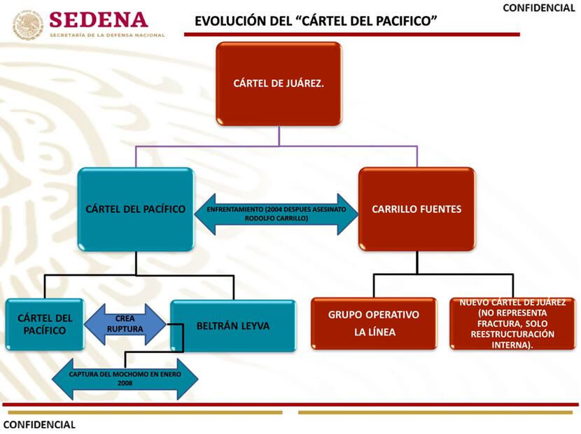 En esas fechas, el CDS estaba estructurado por cuatro facciones: Iván Archivaldo Guzmán Salazar, Ismael Zambada García, Rafael Caro Quintero y Aureliano Guzmán Loera, alias El Guano, hermano de El Chapo y tío de Los Chapitos. Los militares también incluyeron a Juan José Esparragoza Monzón, El Negro o El Azulito, que falleció durante la pandemia de Covid-19.