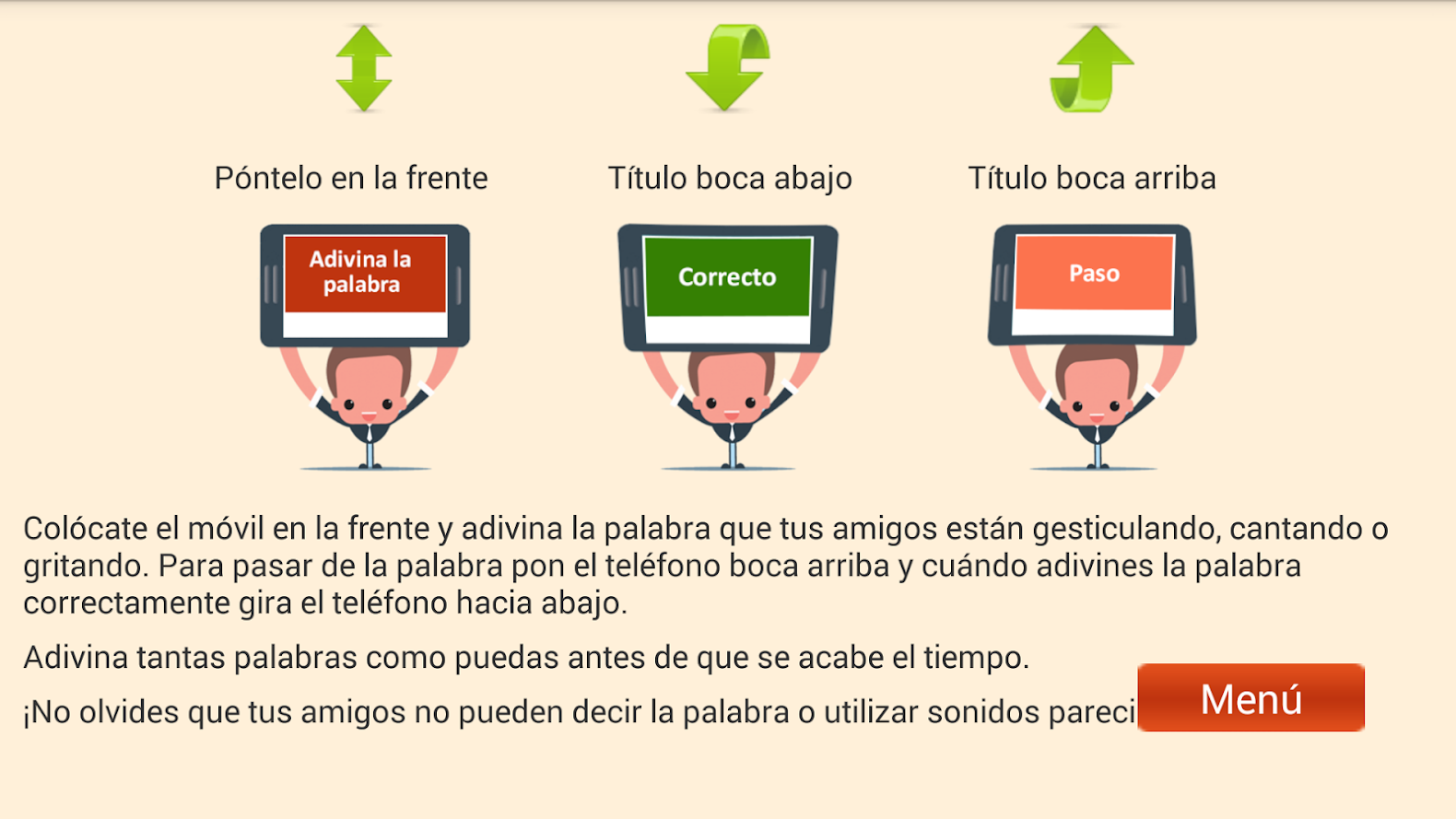 Con esta divertida aplicación para Android , la noche será más buena que nunca. El objetivo del juego es que una persona adivine la palabra que le fue asignada ; el participante en turno se coloca el celular en la frente con la pantalla hacia los demás jugadores , segundos después muestra una palabra que deberá adivinar con la ayuda de las señas que hagan sus compañeros de equipo. Las categorías del juego son: películas, artistas, videojuegos , países, animales, series de televisión , entre muchas más.