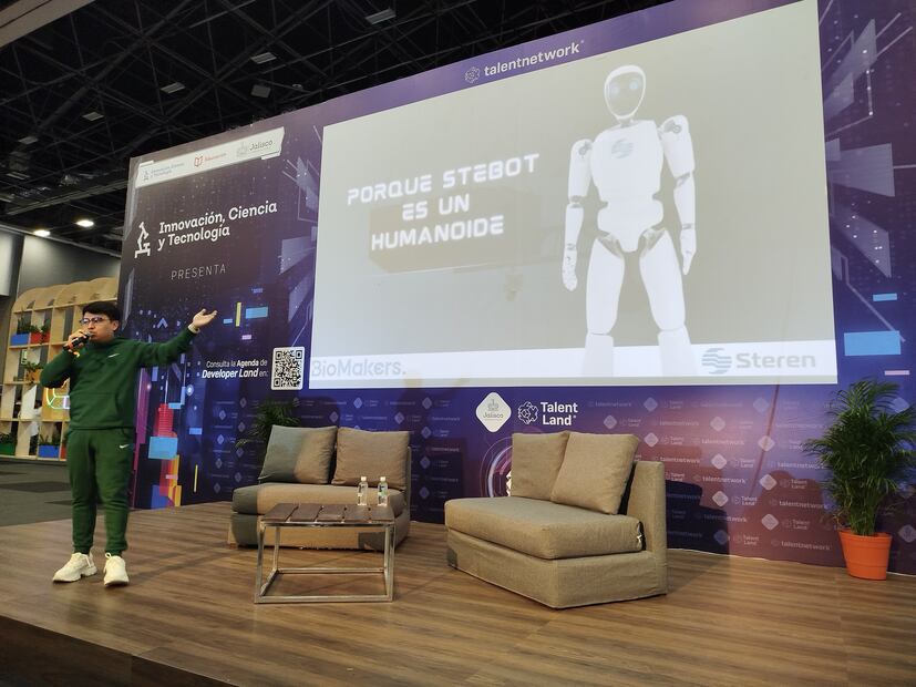 Jonathan Bazán de BioMakers estuvo a cargo del desarrollo de Stebot, el prototipo de robot impulsado con inteligencia artificial de Steren. Los asistentes del Talent Land 2024 fueron los primeros en conocerlo e interactuar con él.