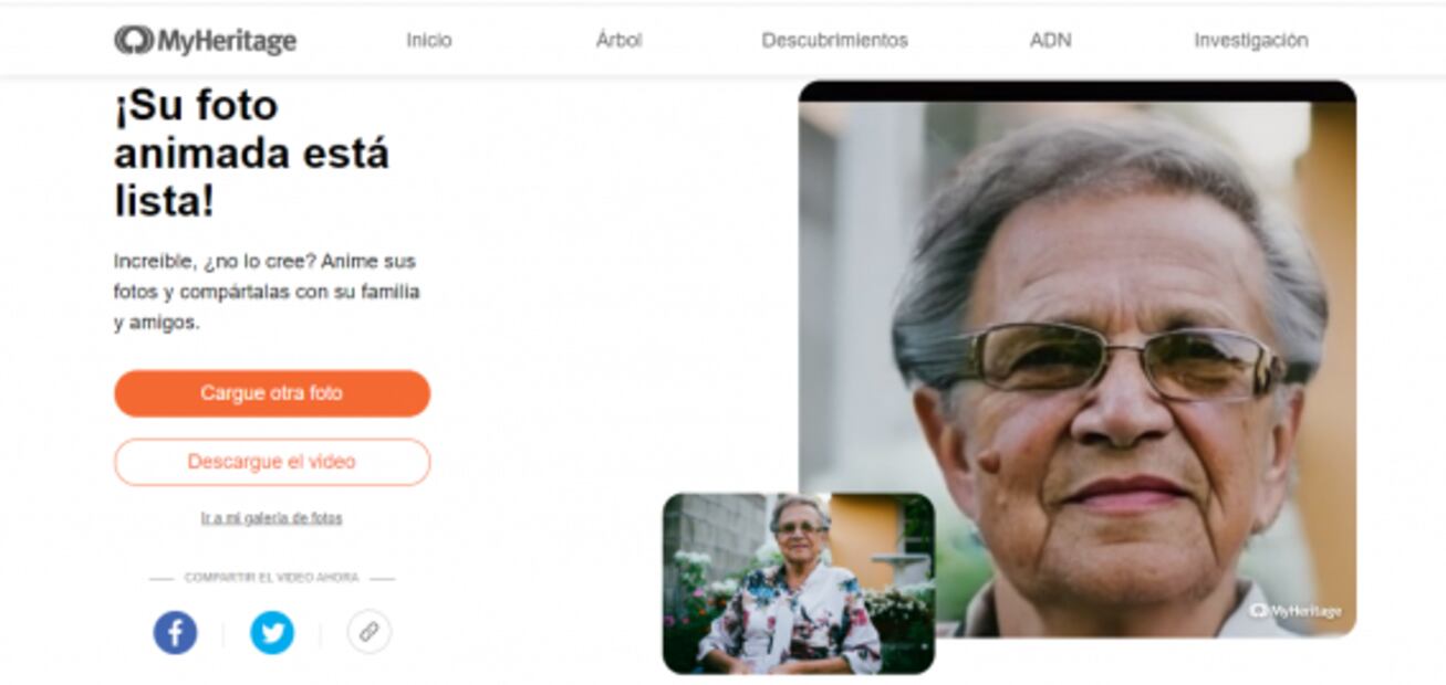 De esta forma se puede aplicar con mucha precisión un video modelo a un rostro que aparece en una determinada foto, y así crear un video corto factible para compartir con amigos y familiares. El video modelo guía los movimientos en la animación para que puedas ver a tus antepasados sonreír, parpadear y girar la cabeza, afirma MyHeritage en su apartado de animación de fotos de su sitio web.