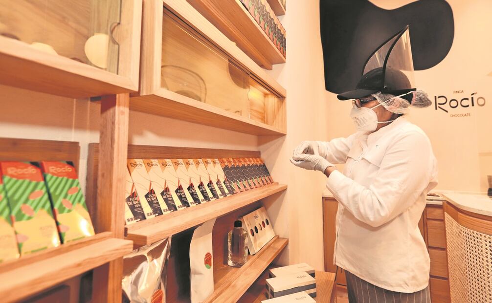 Un estante de madera que agrupa las distintas barras por porcentaje de cacao da color al local pintado en tonos neutros, en los que dependientes atienden a los clientes.