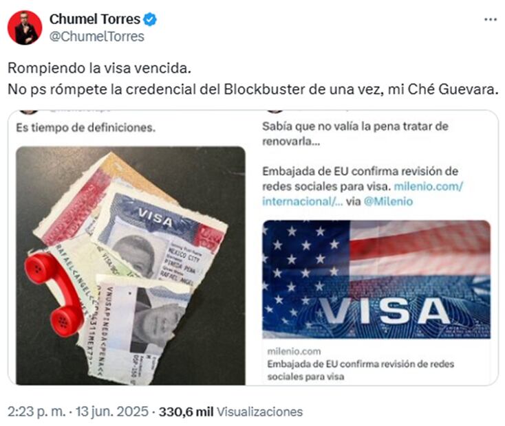 Por lo anterior, en la misma red social, el youtuber Chumel Torres llamó “Che Guevara” al monero, tras compartir la imagen de su visa.