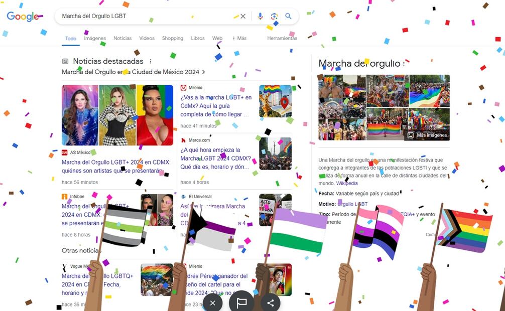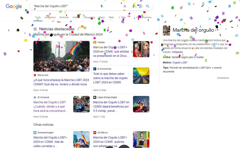 Al realizar búsquedas como 'Marcha del Orgullo', LGBT, 'Pride' o “Marcha del Orgullo LGBT" en su sitio, los usuarios pueden disfrutar de una animación festiva que llena sus pantallas de banderas y serpentinas multicolores.