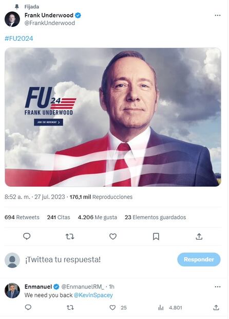 “Bienvenido presidente”, “Te necesitamos de regreso”, “¡Vamos, Frank, vamos!”, “Haz que pase, Netflix”, reaccionaron a la publicación en la que se aprecia una foto de Underwood como aspirante a la presidencia.