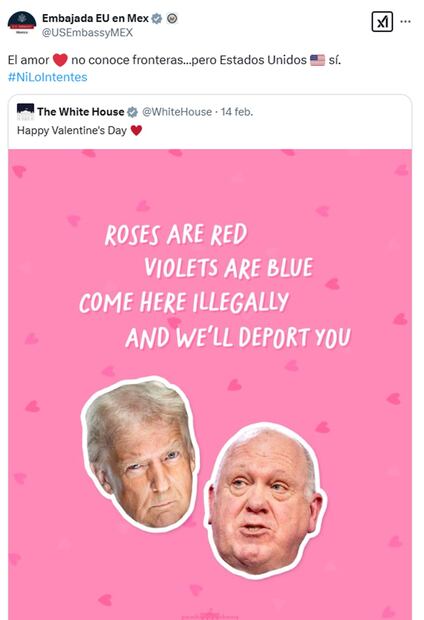 Por lo anterior, la embajada de Estados Unidos en México citó la publicación y creó una nueva dedicatoria que dejó boquiabiertos a propios y extraños. “El amor no conoce fronteras…pero Estados Unidos sí. #NiLoIntentes”.